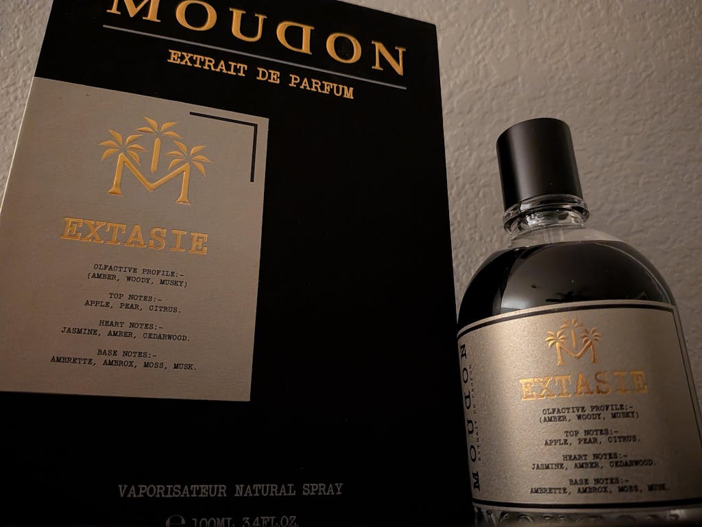 Fragrance Blend: Moudon Extasie Extrait De Parfum starts with crisp apple and pear blended with a citrus zing. Heart notes of jasmine, amber, and cedarwood create a rich, floral depth, settling into a warm, earthy base of ambrette, ambrox, moss, and musk. Particular Events: Evening Gala,