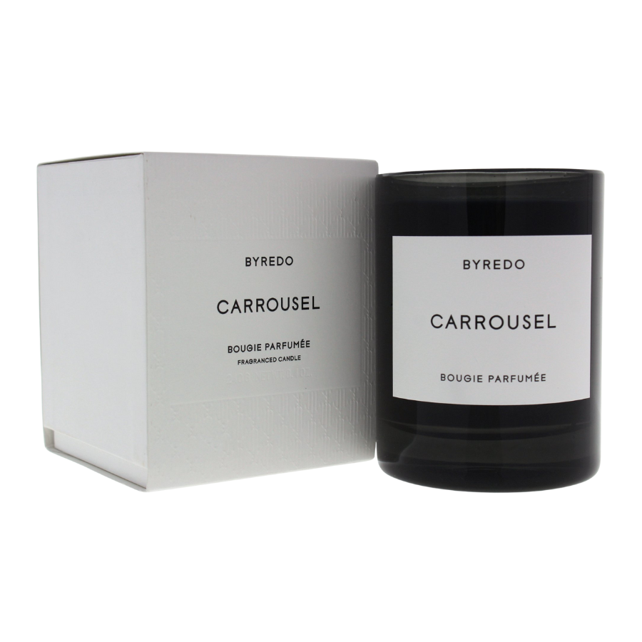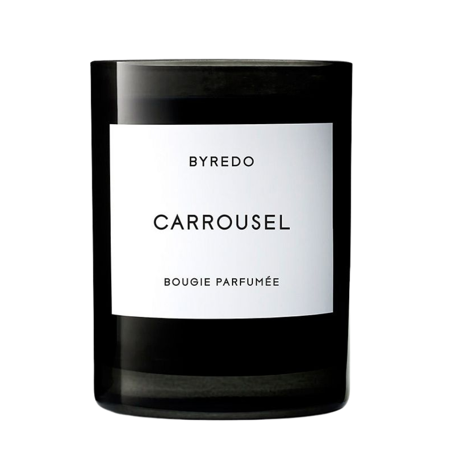 The Byredo Carrousel Fragranced Candle captures the joyful and whimsical essence of a festive carnival ride. This luxurious candle opens with bright and playful top notes of sweet rhubarb and fresh orange, evoking the cheerful atmosphere of a bustling fairground. Heart notes of juicy red apple and rich saffron add a deliciously fruity and slightly spicy layer, enhancing the candle's vibrant character. The base notes of soft, creamy vanilla and warm amber provide a comforting and soothing finish, reminiscent of the delightful treats enjoyed at the fair. Encased in a sleek and modern glass holder, this candle not only fills your space with a delightful and enchanting fragrance but also adds a touch of contemporary elegance to your home decor. Perfect for creating a lively and inviting atmosphere, it transports you to the magical world of a carousel ride, filled with laughter and joy.